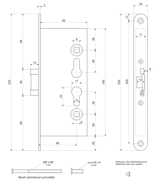 • Замок врезной противопожарный Apecs 2000-ZN (цилиндровый, ключ-ключ);