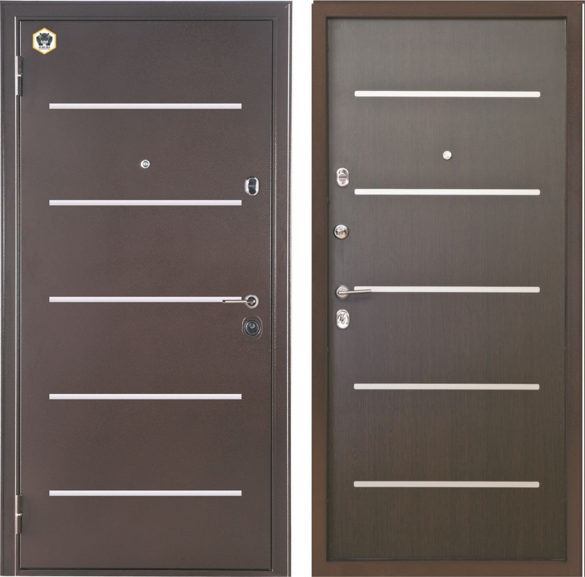 Входная дверь «Бульдорс Laser-24» – это сочетание надежности, практичности и стильного дизайна. Внешняя часть ее полотна отделана стальным листом, покрытым полимерной порошковой краской с антивандальными свойствами. Внутренняя поверхность двери представляет собой МДФ толщиной 10 мм с виниловым верхним слоем, имитирующим древесину ценных пород (цвет "Венге"). С обеих сторон полотно украшено параллельными полосами из светлого композита.