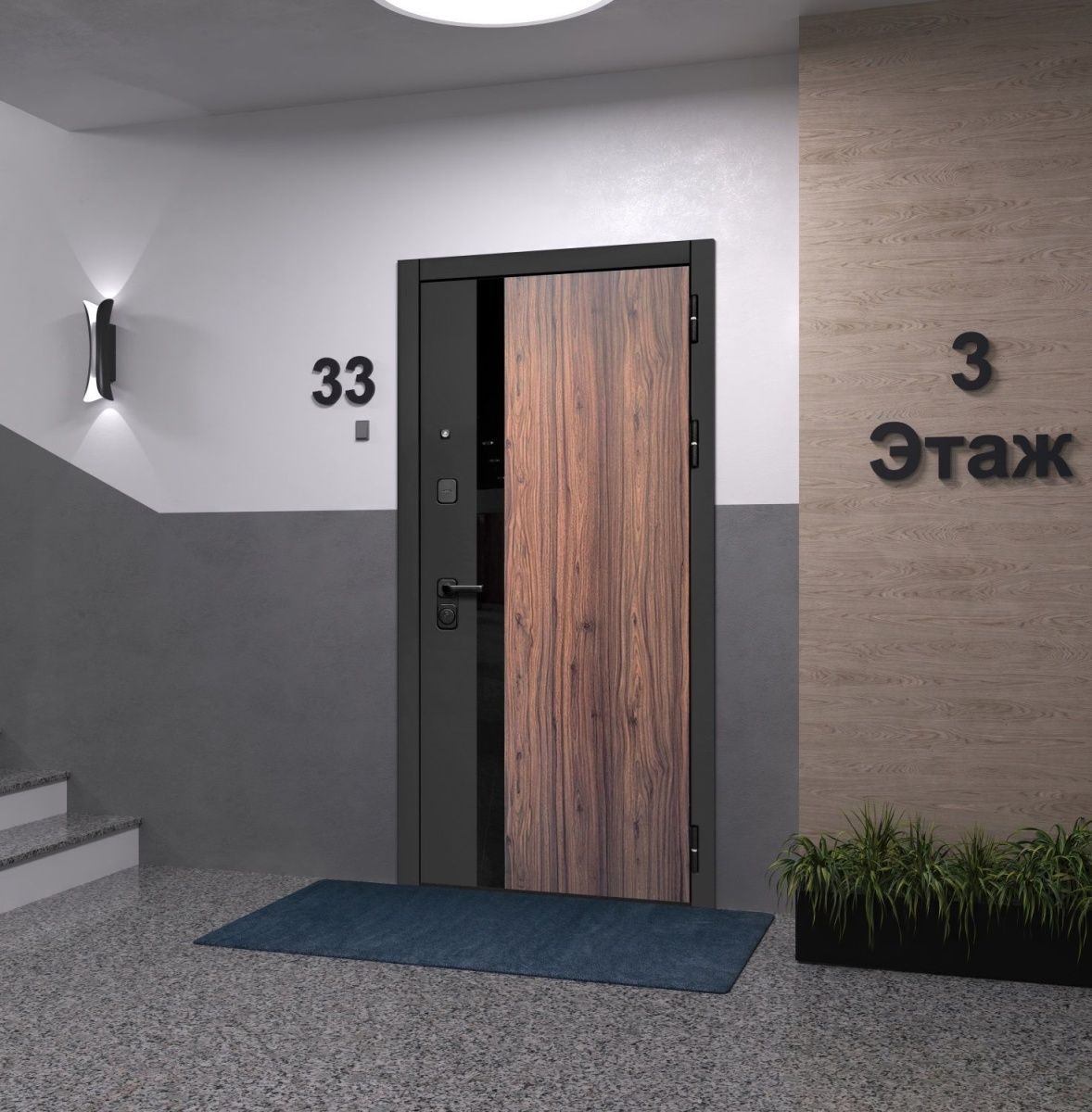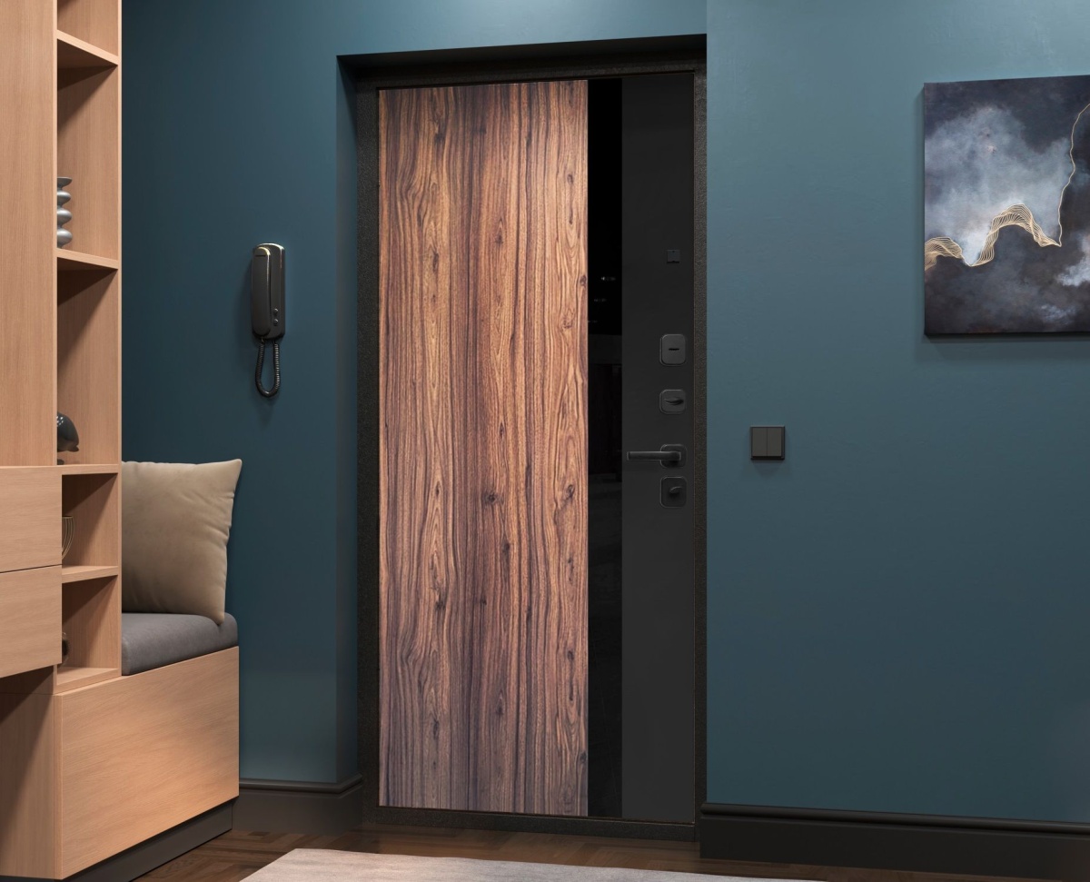 Внешнее покрытие: фрезерованные МДФ-панели 12 мм, «Орех каньон коньяк», «Сатин черный», наличник «Сатин черный». Вставка - черный лакобель