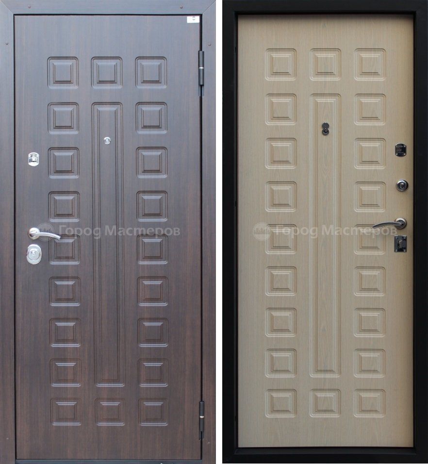 • Стальной кожух для защиты замка - в полотне и ригелей - в коробе, противосъемные ригели (защита от спиливания петель), ребра жесткости (два вертикальных и два горизонтальных);